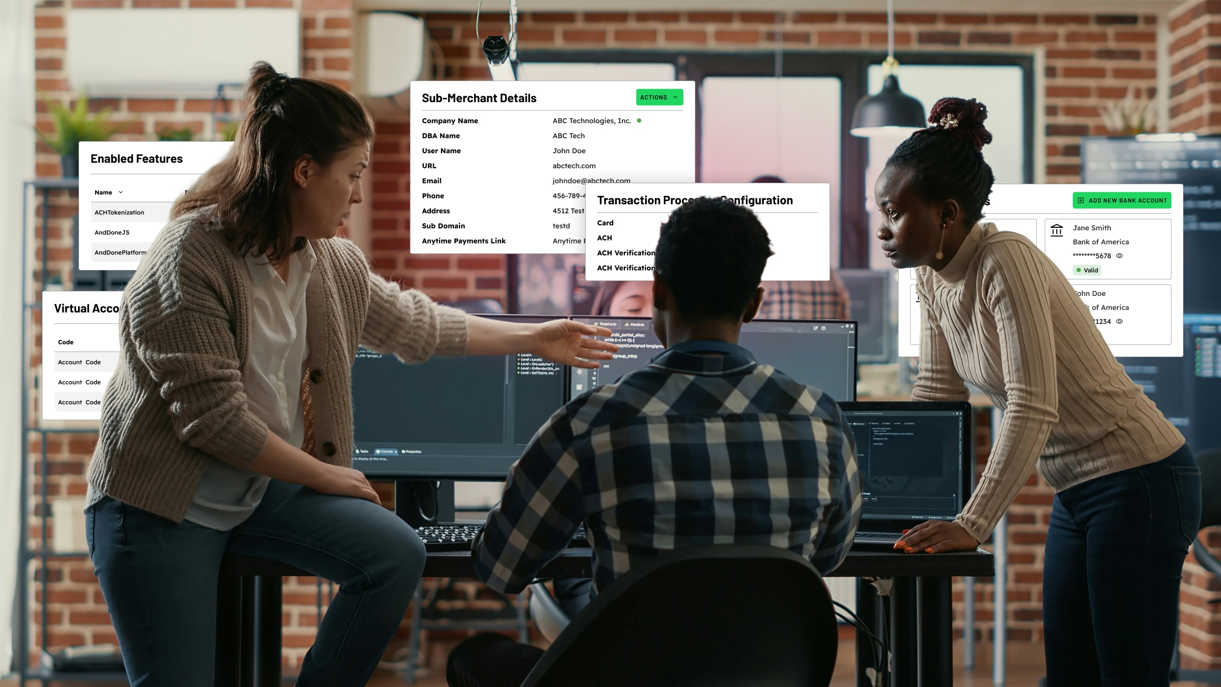 Use anddone.js or the Secure API to start accepting payments on behalf of your merchants. One integration powers payments across your entire merchant network. No custom builds per merchant.
